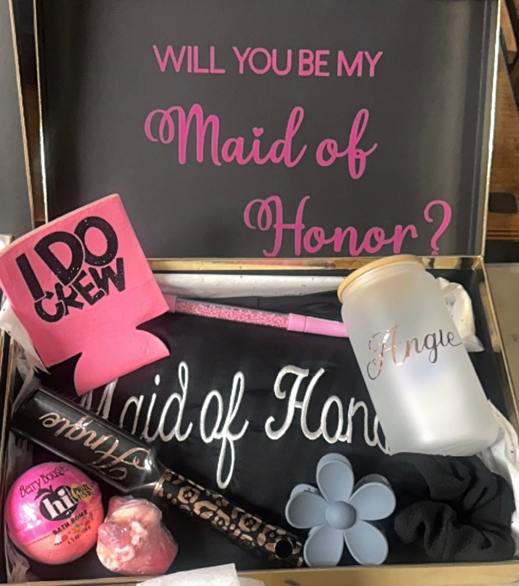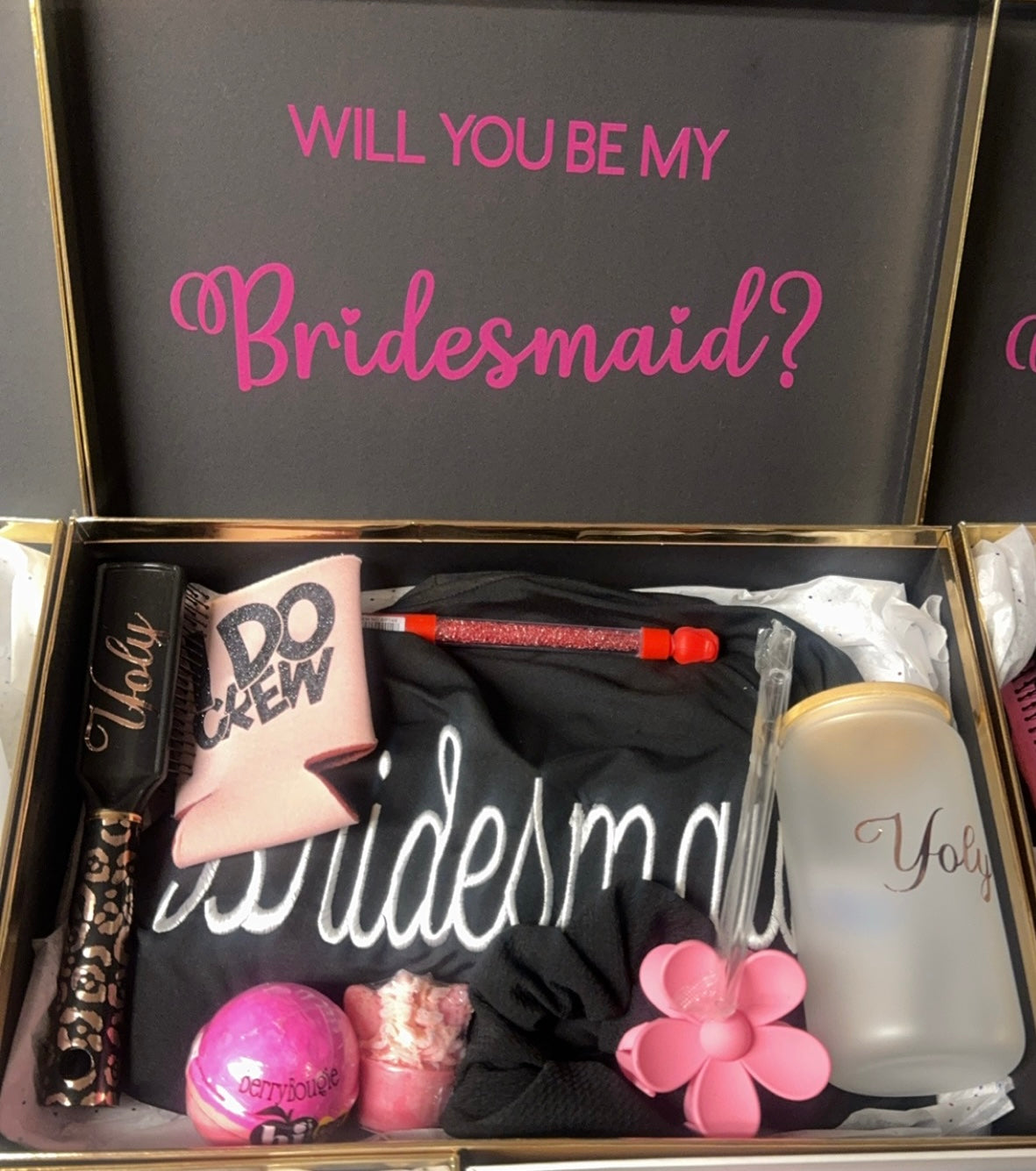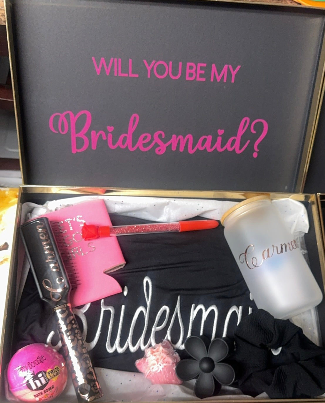 You can choose from a soft cotton robe, trimmed with elegant lace that can be embroidered with bridesmaid or a name, or even with a single initial in a variety of colors. A customized Bridesmaid Themed shirt. A personalized double-walled insulated cup. You can also choose a variety of personalized accessories to the box (Customized hairbrush, pens, clips, candles, bath bombs, wax melts, koozies, or jewelry). One of our beautiful 18K vacuum plated heart necklaces (silver, gold, and rose gold). Your bridesmaids will cherish these necklaces and the customized gift boxes they come in. "Thank you for being..." or "Will you be my...". included. Lastly, a luxurious custom-made box with your choice of font and ribbon color. There’s nothing like seeing the bliss on her face when you give this luxury gift box set to your bridesmaid!